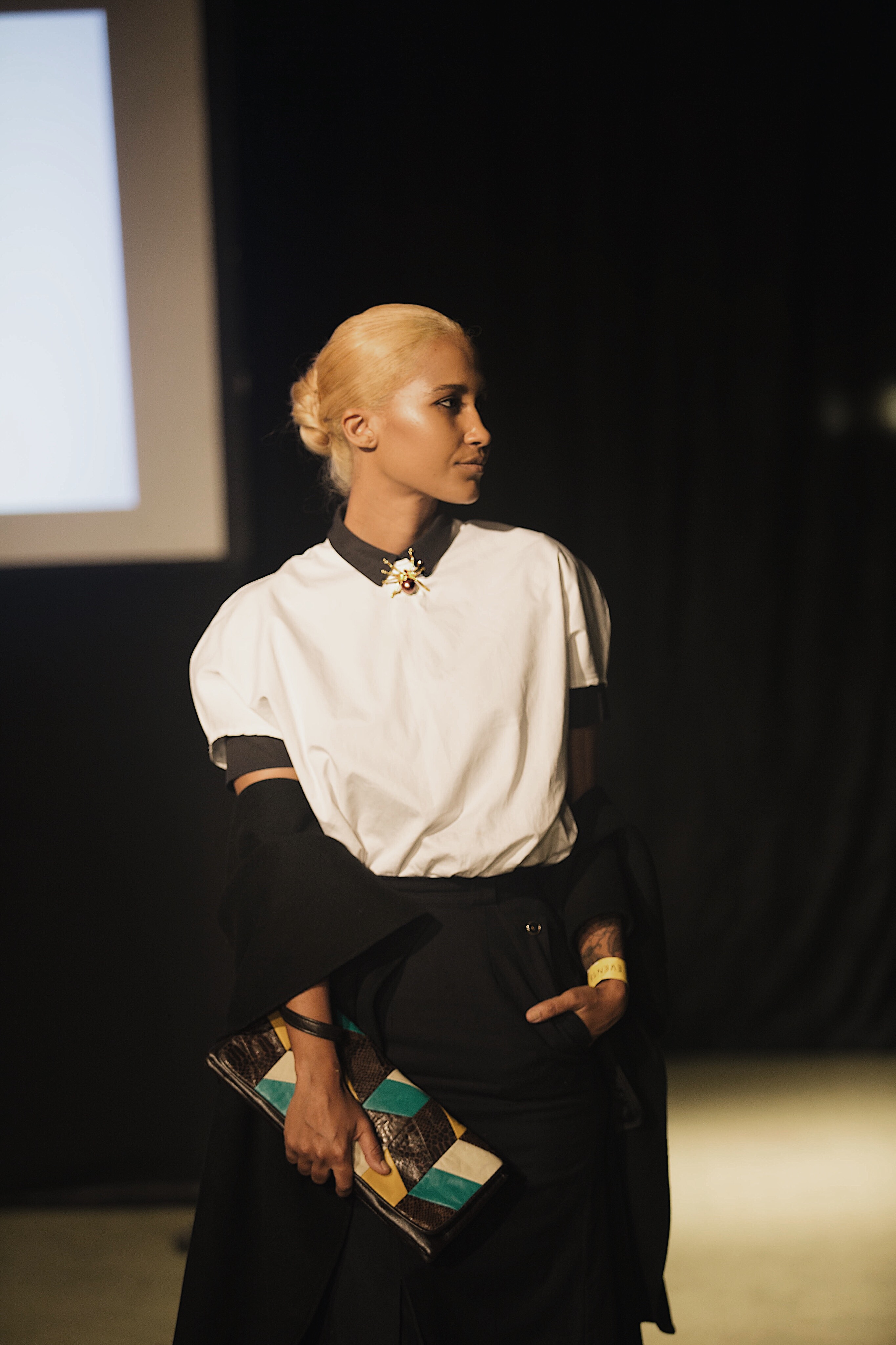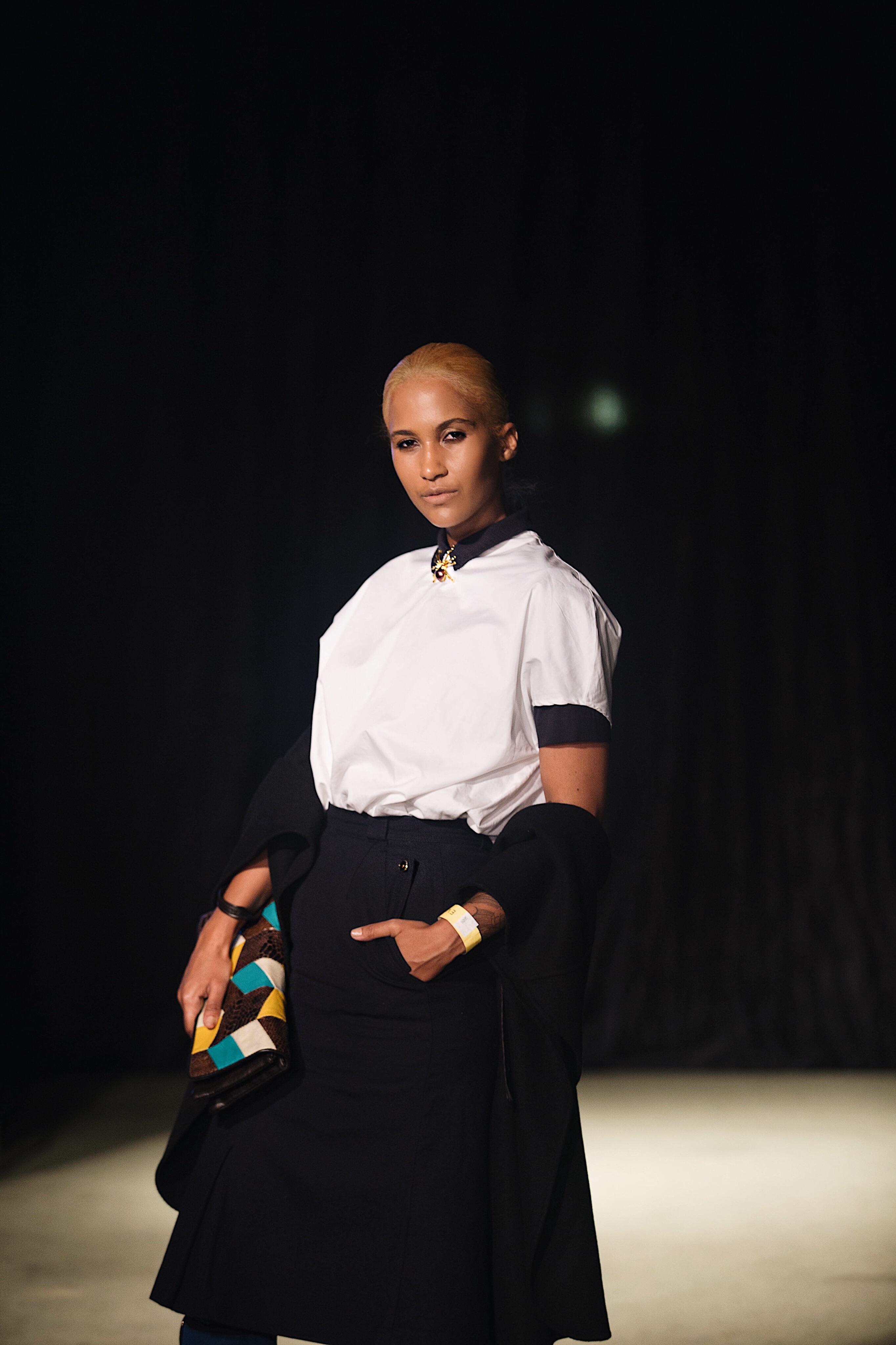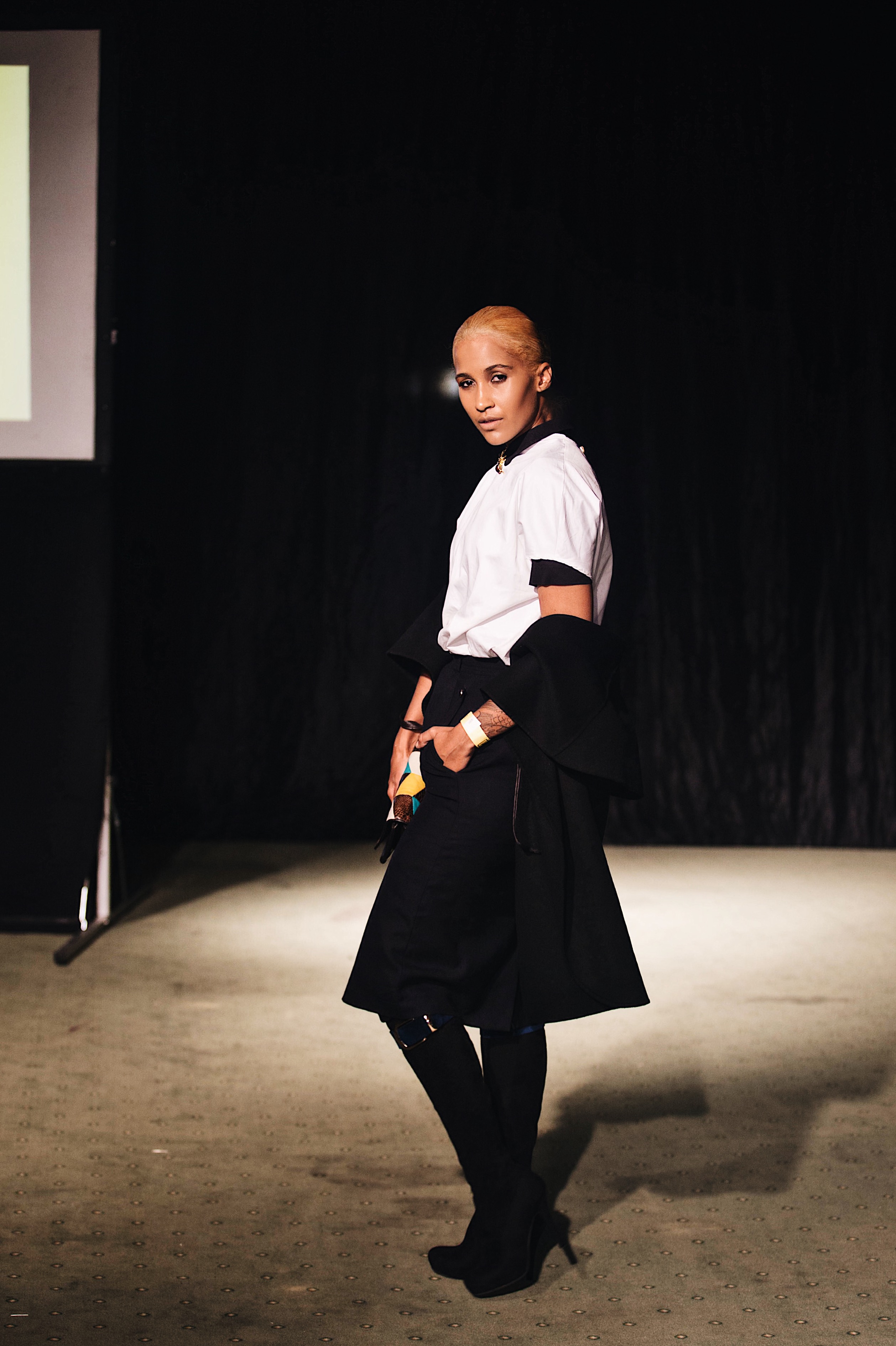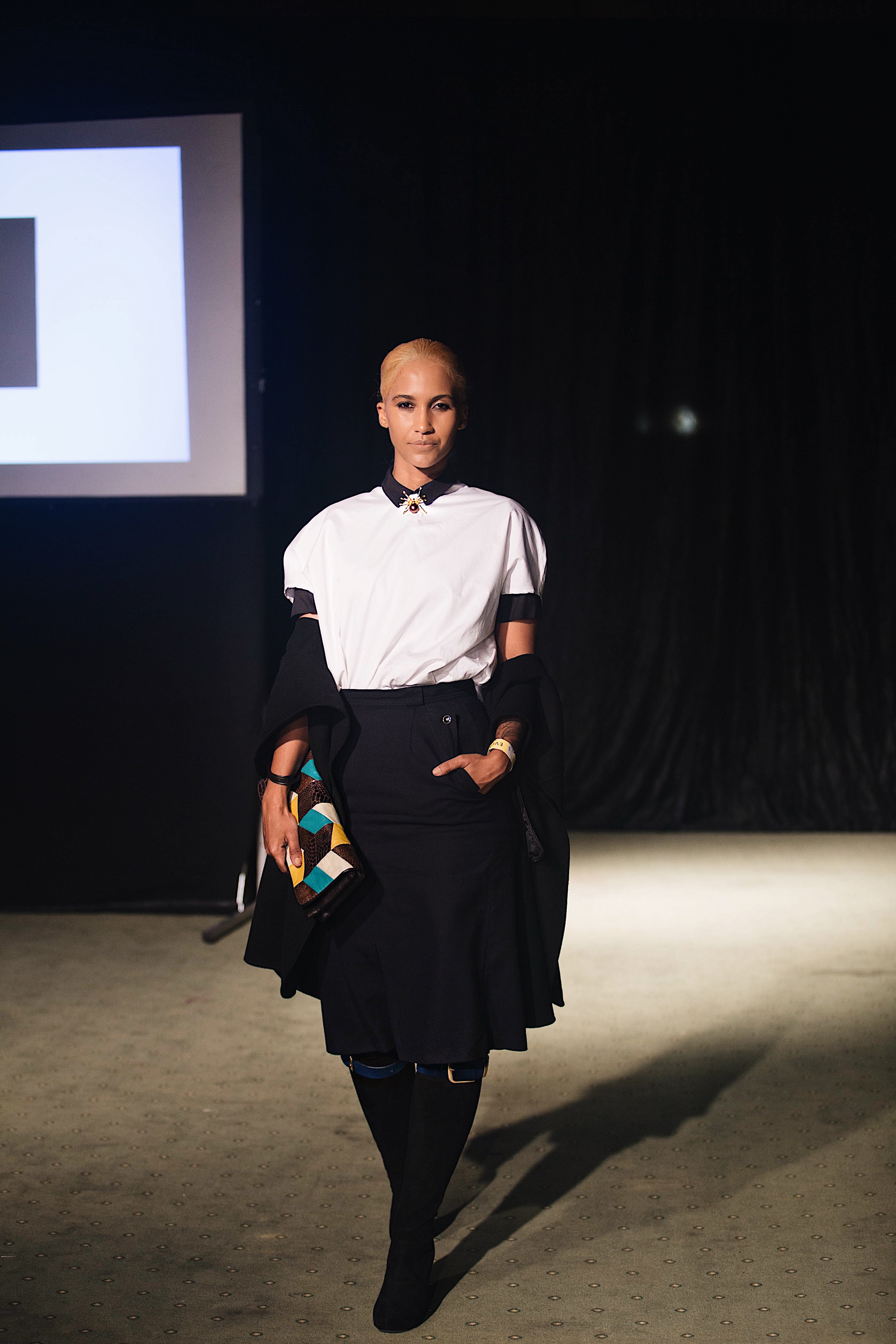 So, for Day 3 of Windhoek Fashion Week, which was held at the Nampower Convention Centre, I found myself draped in a navy blue short sleeves shirt from COS, which I paired with a white dress shirt from My Republik and a spider brooch from The Sequel Vintage. I chose a knee-length navy blue skirt, also from The Sequel Vintage and thigh high boots from Foschini, which I wore with belts. To add a final layer to my look, I wore a sleeves black coat from Zara. The handbag is so old that I can no longer remember where I purchased it.